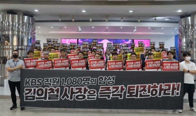 '새로운 KBS를 위한 KBS 직원과 현업방송인 공동투쟁위원회'가 서울 여의도 본사에서 기자회견을 열고 김의철 사장의 퇴진을 촉구하고 있다. 새 KBS 공투위
