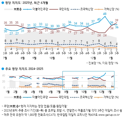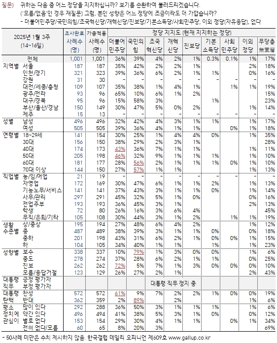 한국갤럽이 지난 14∼16일(1월 셋째 주) 전국 만 18세 이상 남녀 1001명을 대상으로 조사(5% 신뢰수준에 표본오차 ±3.1%포인트)한 결과 이같이 집계됐다.