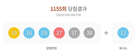 동행복권에 따르면 1등 당첨 번호는 10, 16, 19, 27, 37, 38이며, 2등 보너스 번호는 13이다.
