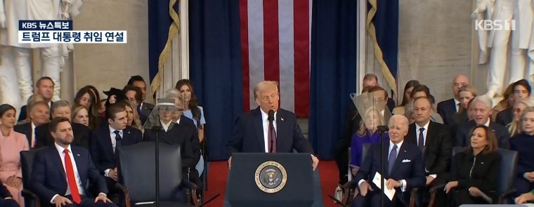 트럼프 대통령이 취임사를 하는 가운데 오른쪽에 바이든 전 대통령과 해리스 부통령(대선 민주당 후보)이 앉아 경청하고 있다.