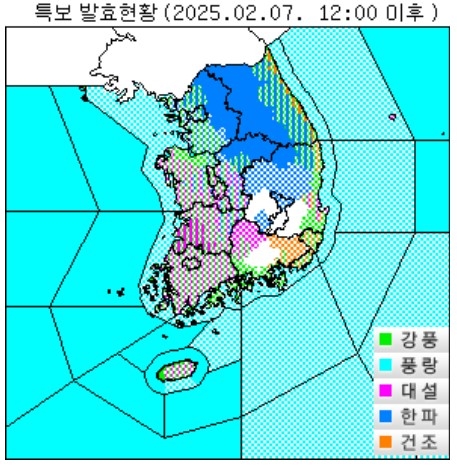 7일 낮 12시 기준 기상특보 현황. 중부에 한파특보, 충청과 호남에 대설특보, 해안 지역에는 강풍특보가 발효돼 있다. 기상청