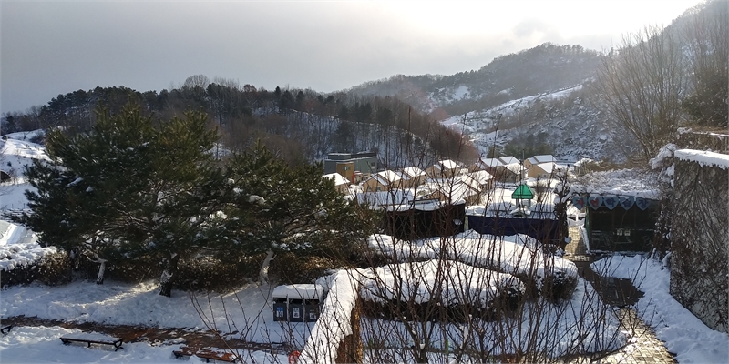 통영~대전고속도로 충남 금산군 금산인삼랜드 휴게소 근처 마을에 폭설이 내린 모습. 정기홍 기자