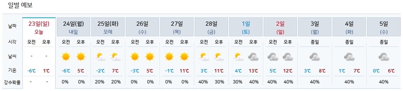 25일은 평년 기온은 최저 영하 8도에서 영하 1도, 최고 6~11도로 예보됐다.