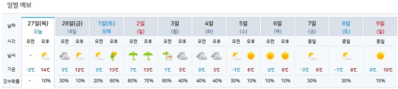 2일부터는 전국에 비가 본격적으로 내린다. 찬 대륙 고기압도 북쪽에서 확장하면서 기온이 낮아진다. 강원 동해안 지역에는 기온이 떨어져 눈이 온다.