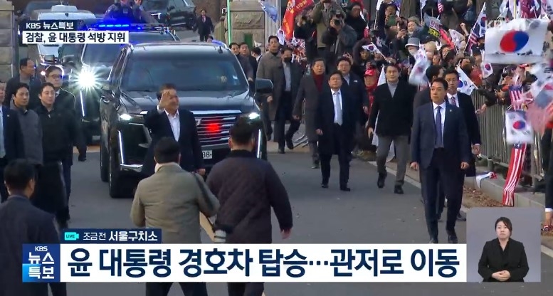 윤석열 대통령이 8일 오후 경기 의왕시 서울구치소에서 석방된 직후 구치소 정문 앞에서 타고 나오던 경호차량에서 내려 지지자들에게 감사의 표시를 하고 있다. KBS 중계 캡처