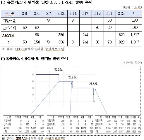 강민국 의원실(경남 진주시을)이 한국예탁결제원 증권정보포터털(SEIBRO) 자료를 조사․분석한 결과, 홈플러스는 신용등급이 A3-로 하락한 2월에만 9일, 11회에 걸쳐 단기물을 발행했다. 발행액은 무려 1807억원에 달했다.