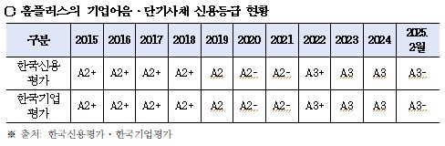 또 홈플러스 신용등급 및 단기물 발행 추이를 보면, 지난 2022년 2월 24일 기존 A2-에서 A3+로 신용등급 하락 시 발행한 단기물 규모는 1185억 원이었으며, 2023년 2월 27일 A3+에서 A3로 하락 시에는 1078억 원, 이번 2025년 2월 27일 A3에서 A3-로 신용등급 하락에서는 1807억원으로 가장 많은 단기물이 발행됐다.