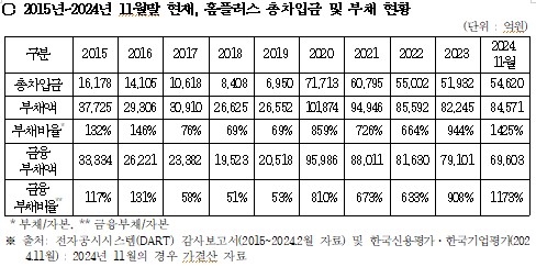 한편 가결산 자료를 통해 확인된 홈플러스의 부채액은 지난해인 2024년 11월 말 기준, 8조 4571억 원이며 부채비율은 1425%였다. 이 중 금융부채 규모는 6조 9603억 원으로 금융부채비율은 1173%에 달했다.