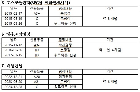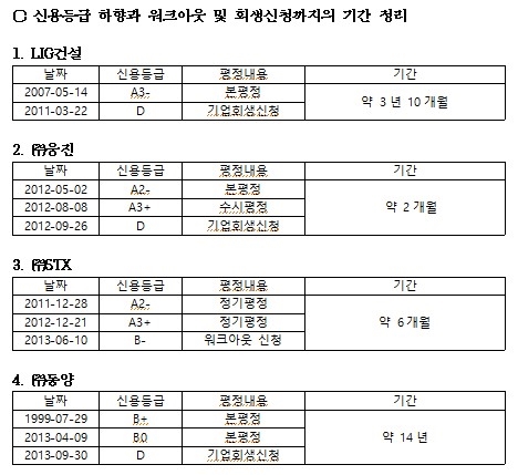하지만 2010~2024년 '신용등급 하향과 워크아웃 및 회생신청 기업'은 7개이며, 이 중 기업회생 신청 기간이 오래 걸린 기업은 LIG건설(약 3년 10개월)이었으며, 기간이 가장 짧았던 기업은 ㈜웅진으로 약 2개월이 걸렸다.