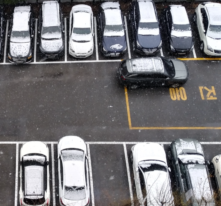 18일 오전 8시 40분쯤 서울 강서구의 한 아파트 차량 위에 눈이 하얗게 쌓인 가운데 눈발이 날리고 있다. 기온은 0.4도였다. 서울 북부엔 밤새 눈이 많이 내렸다. 정기홍 기자