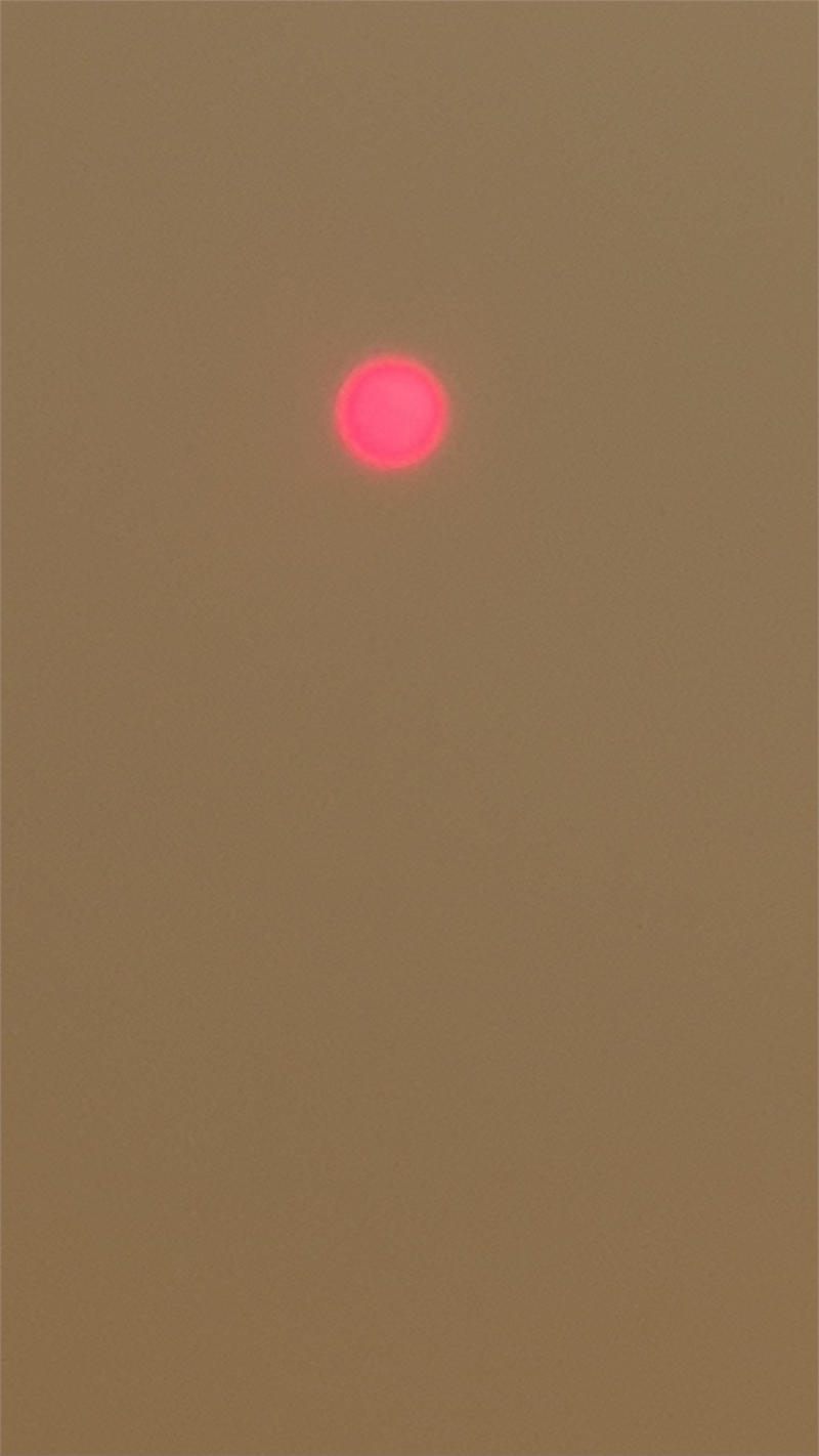 시커먼 산불 연기가 하늘을 온통 뒤덮으면서 하늘이 흑색으로 변한 가운데 대낮의 해가 홍시처럼 보이고 있다. 박성원 씨 제공