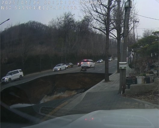 서울 강동구 명일동에서 발생한 대형 싱크홀의 상수도 배관에서 물이 흘러나오고 있다. 블랙박스 운전자 김규현 씨 유튜브 캡처