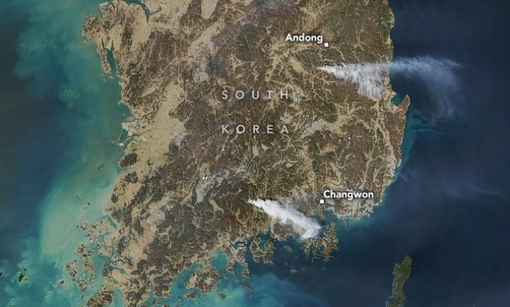 지난 21일 경남 산청, 다음 날 경북 의성 등 전국 곳곳에서 발생한 산불이 건조 날씨에 강한 바람을 타고 대형 재난으로 커진 가운데 미국 항공우주국(NASA)이 화재 상황이 담긴 한반도 위성 사진을 공개했다.