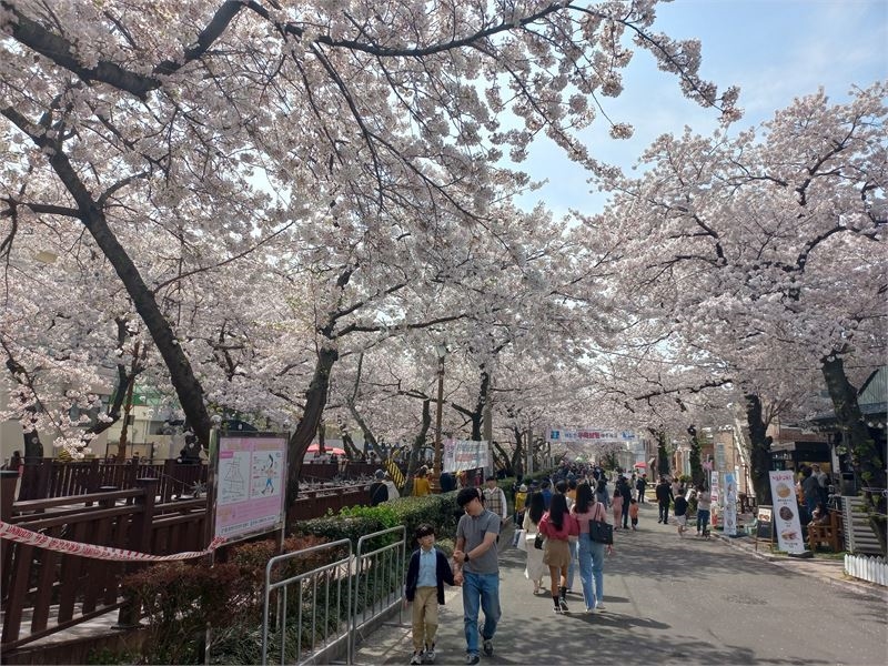 지난 2023년 진해군항제에서 진해 여좌천 주변에 벚꽃이 만개해 있는 가운데 가족과 친구, 연인 등이 거닐며 벚꽃 운치를 즐기고 있다. 창원시