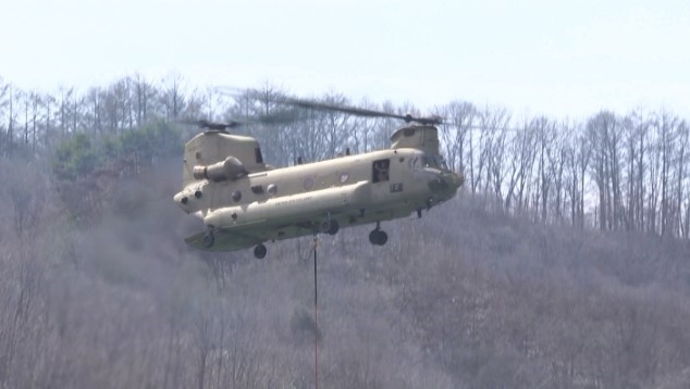 28~29일 경남 산청군 대형 산불 현장에 투입된 주한미군 소속 대형헬기인 치누크(CH-47). 주한미군은 치누크(CH-47) 1대와 블랙호크(UH-60) 3대를 산청 산불 현장에 보내 진화 작업을 펼쳤다. 두 기종은 담수 용량이 각각 5t, 1.5t이다. 경남도