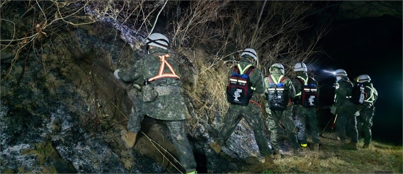 지난 28일 밤 경남 산청 산불 야간 진화 지원작전에 투입된 39사단 장병들이 불씨를 정리하고 있다. 육군 제39보병사단