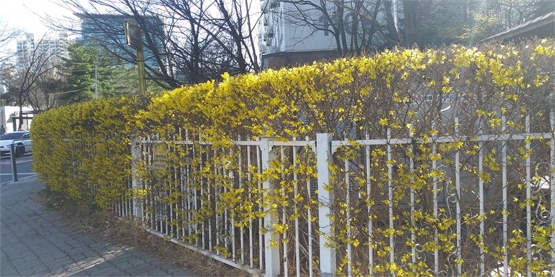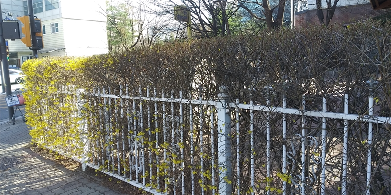 울타리 왼쪽에서는 노란 개나리가 제법 꽃을 피우고 있다. 철제 울타리는 도로를 따라 다소 꺾어져 있다. 위의 사진 오른쪽, 꽃이 피지 않은 곳은 꺾어진 곳에서 더 오른쪽의 모습니다.