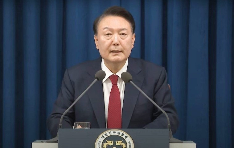 윤석열 대통령이 지난해 12월 3일 긴급담화를 통해 “지금 대한민국은 당장 무너져도 이상하지 않을 정도의 풍전등화의 운명에 처해있다”며 비상계엄을 선언하고 있다.