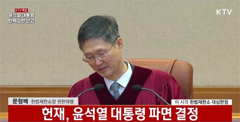 문형배 헌법재판소장 권한대행이 4일 주문을 다 읽은 다음 파면을 선고하고 있다. KTV 중계 캡처