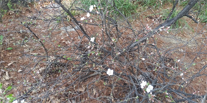 거무튀튀한 작은 가지들 사이에 하나씩 하얀 꽃을 틔우는 앵두나무의 모습
