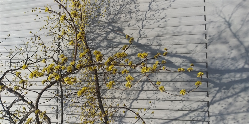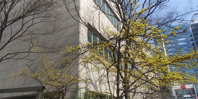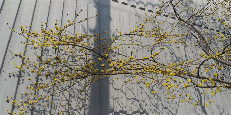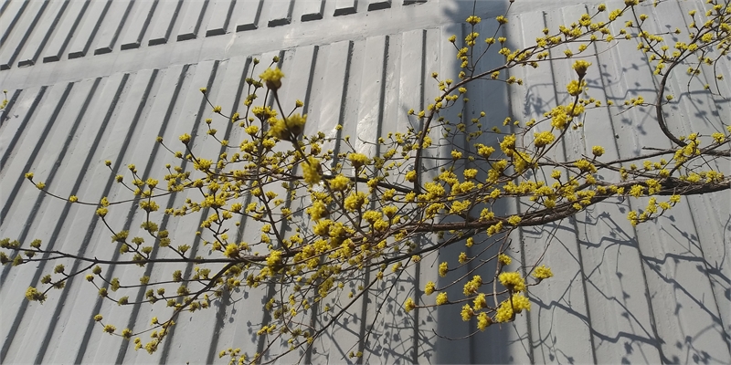 아파트 외벽을 배경으로 노란색의 꽃잎을 내놓은 산수유 모습