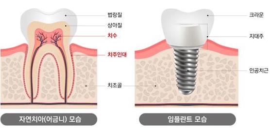 사람의 치아는 치주인대라는 결합 조직이 치근(이의 뿌리)을 감싸 지지한다. 반면 임플란트 수술은 치아가 빠진 치조골(잇몸 뼈)에 티타늄으로 만든 치근을 심은 뒤 인공 치아를 연결한다.