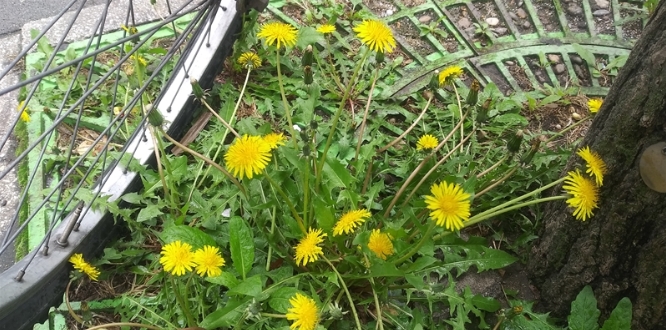 도로변 인도에 세워진 자전거 바퀴 옆에 10여 개의 민들레꽃이 피었다.