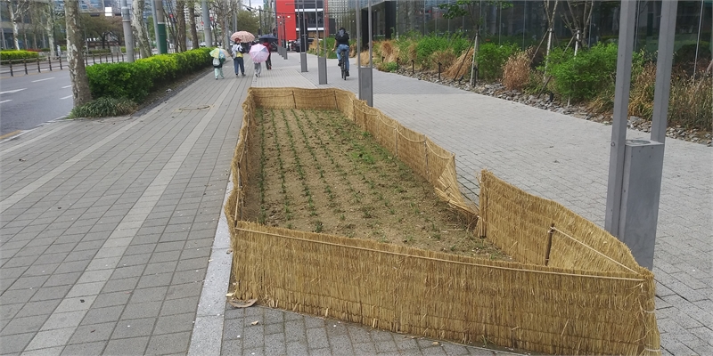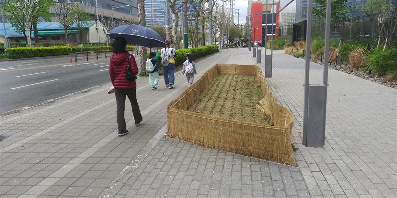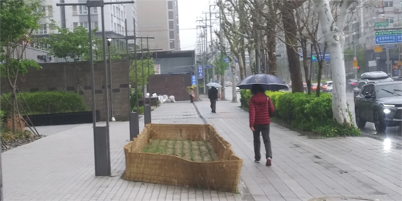볏짚울타리 속에서 돋아난 초록색 작은 싹. 봄비 내리던 지난 4월 19일 모습이다. 두 아이와 어머니, 우산을 쓴 한 여성이 화단 옆을 지나고 있다.