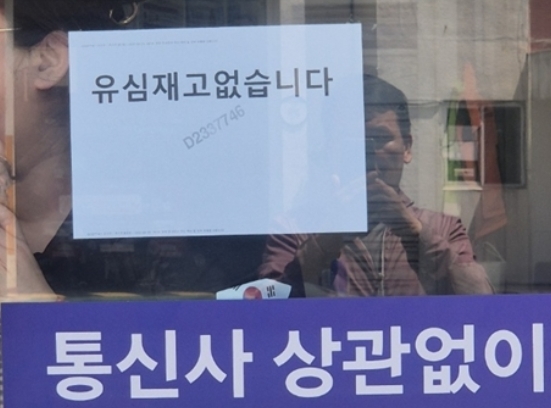 경남 창원시 성산구 가음정시장 인근에 있는 SK텔레콤 대리점 입구 문에 '유심 재고 없다'고 쓴 안내문이 붙어 있다.독자 정재송 씨 제공