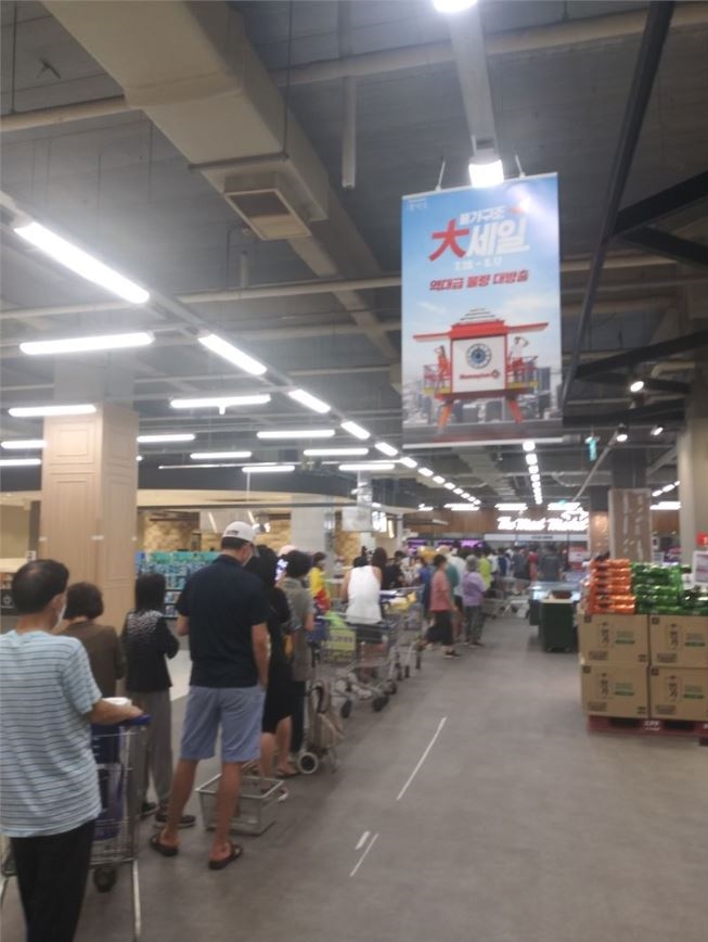 2022년 말복인 8월 15일 강서구의 홈플러스 매장에서 '당당치킨'을 사기 위해 줄을 길게 서 있다. 이날 복날을 맞아 평상시 가격인 6990원에서 1000원 싼 가격에 판매했다. 정기홍 기자