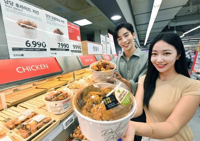 홈플러스 모델들이 2022년 8월 서울 마포구 성산동 홈플러스 월드컵점에서 홈플5일장 행사상품으로 당당치킨을 소개하고 있다. 이상 홈플러스