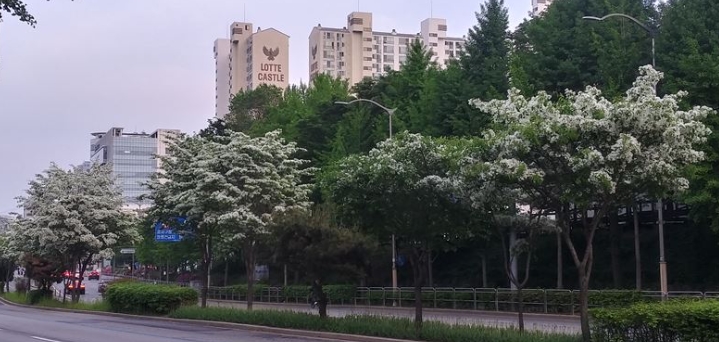 서울 강서구 강서구청사거리 KBS스포츠센터(아레나) 인근 대로변에 핀 이팝꽃 모습. 배 고팠던 고릿고개 시절 멀리서 보면 흰 쌀밥처럼 보여 허기진 배를 채웠다는 '웃픈' 이팝꽃이다. 하지 무렵에 피는 시절꽃이다. 정기홍 기자