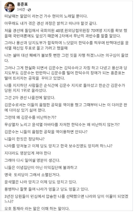 홍 전 시장은 "'떠날 때는 말 없이'라는 건 가수 현미의 노래일 뿐"이라며 "아무래도 내가 겪은 경선 과정은 밝히고 떠나야 할 것"이라고 입을 열었다.