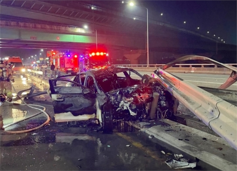 중앙분리대를 들이받은 K5 차량은 불이 났지만 출동한 소방대에 의해 17분 만에 꺼졌고, 운전자와 동승자 등 3명은 가벼운 상처만 입었다.