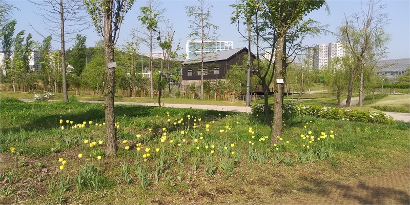 노란 튤립이 흩어져 피어 있다. 뒤쪽 검은 건물은 마곡문화관(2007년 등록문화유산 제 363호)으로 옛 양천수리조합 배수펌프장이었다. 현존하는 한국 근대 산업 문화유산 중 유일하게 원형이 남아 있는 건축물이다.