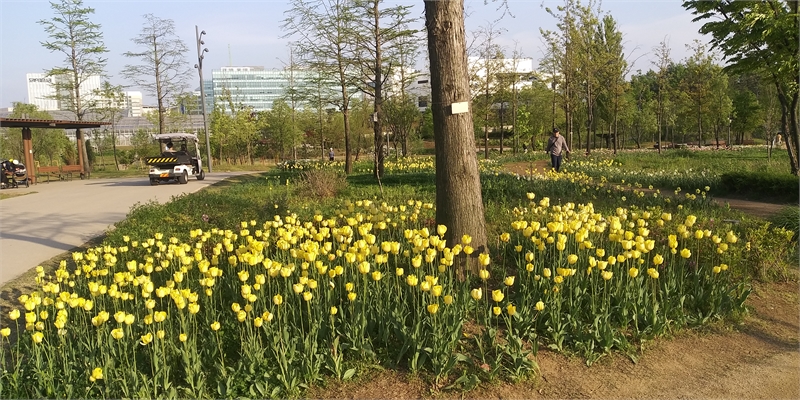 노란 튤립이 산책길 근처에 피어 봄날의 분위기가 물씬 난다.