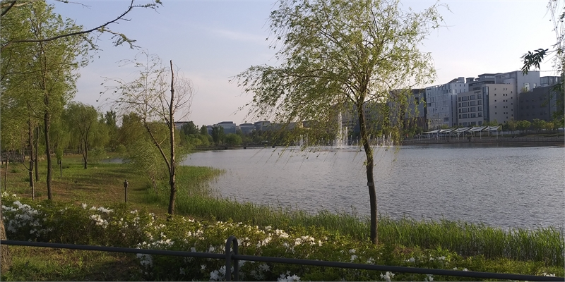 한강 쪽에서 '열린숲'을 바라본 '호수원' 모습. 흰 튤립이 마지막 자태를 뽐내고 있고, 호수에는 분수가 솟아 운치를 더한다. 저 멀리엔 LG사이언스파크 건물이 보인다. 호수 둘레로 산책길이 나 있고 제철 꽃식물이 식재돼 이어 피고 있어 산책길 힐링 에너지를 듬뿍 안겨주었다.