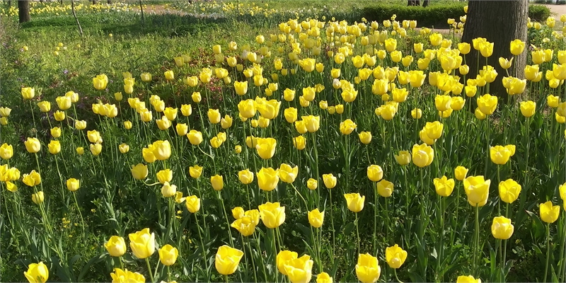 튤립 화단. 튤립을 군락으로 심어 한 곳에서 한꺼번에 노란 꽃잎을 드러내고 있다.