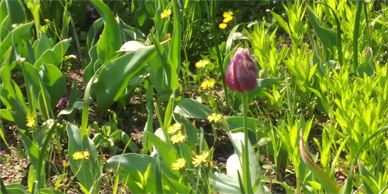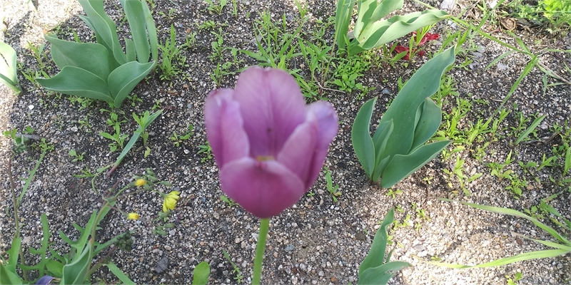 튤립이꽃은 지고 입사귀가 푸르름을 뽐내고 있다. 그 옆에 자주색(퍼플색) 튤립이 홀로 피어 있다.