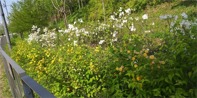 '호수원'가에 난 메인 길 옆 철책에 핀 황매화. 주위에 흰 철쭉도 피어 있다. 흰꽃은 철쭉인지 영산홍인지 기자는 구분하기 어렵다.