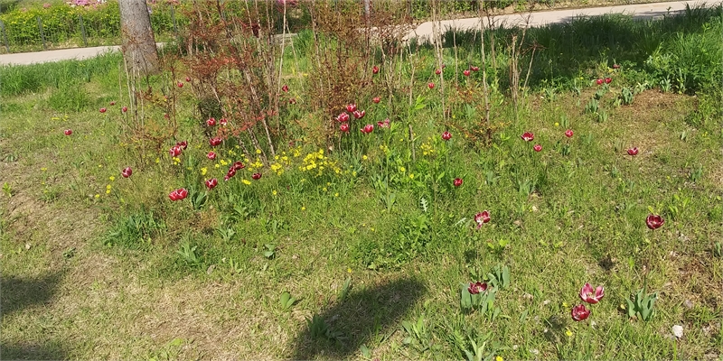 노란빛 자주색 튤립들이 "날 좀 보소"라고 하는 듯 활짝 피어 자태를 뽑내고 있다. 촘촘히 자리해 도시에 피는 인공적인 화단보다 휠씬 더 정취가 좋다.