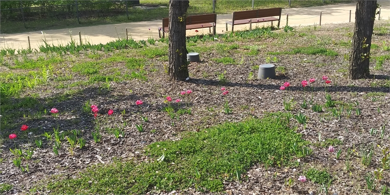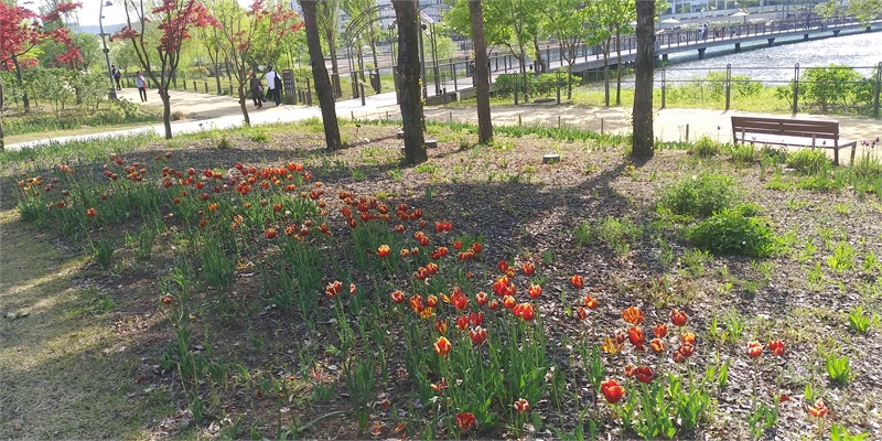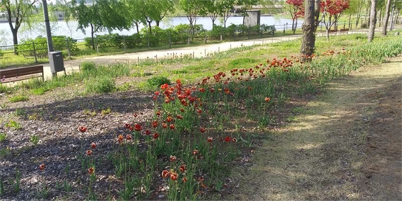 왼쪽 호수를 끼고 걷다 보니 산보길 따라 피어 있는 노란빛 자두색 튤립들이 눈에 쏙 들어온다. 만개해 꽃잎을 활짝 터뜨렸다. 특별히 와닿은 건 식물원 튤립존에 사라진 튤립의 아쉬움 때문으로, 구경을 대신하기에 충분했다.