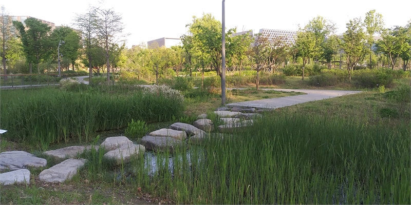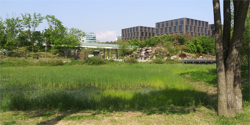 수초가 난 작은 습지 도랑을 가로 지른 징검다리. 큼지막한 돌을 놓아 운치가 있다. 저 멀리 가장 아름다운 건물로 선정된 코오롱 건물(코오롱 One&Only타워)이 보인다. 5호선 발산역 쪽을 보고 찍었다.