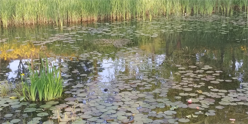 '열린숲'에 만들어놓은 작은 연못과 같은 늪. 늪 주위에 수양버들 등이 자리한 가운데 늪엔 온통 개구리밥 잎이 떠있다.
