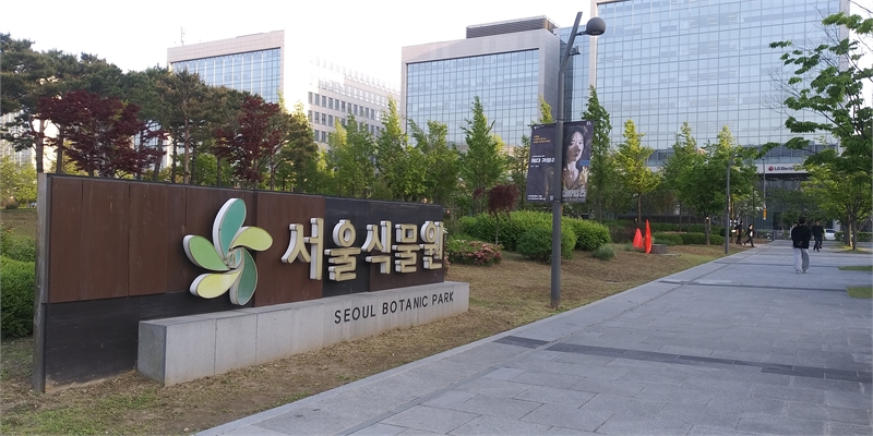 지하철 9호선과 인천국제공항전철 환승역인 마곡나루역 쪽 서울식물원 안내 입간판. 옆 건물들은 LG사이언스파크 건물이다. 비슷한 건물이 20여 개가 나란히 위치하고 있다.