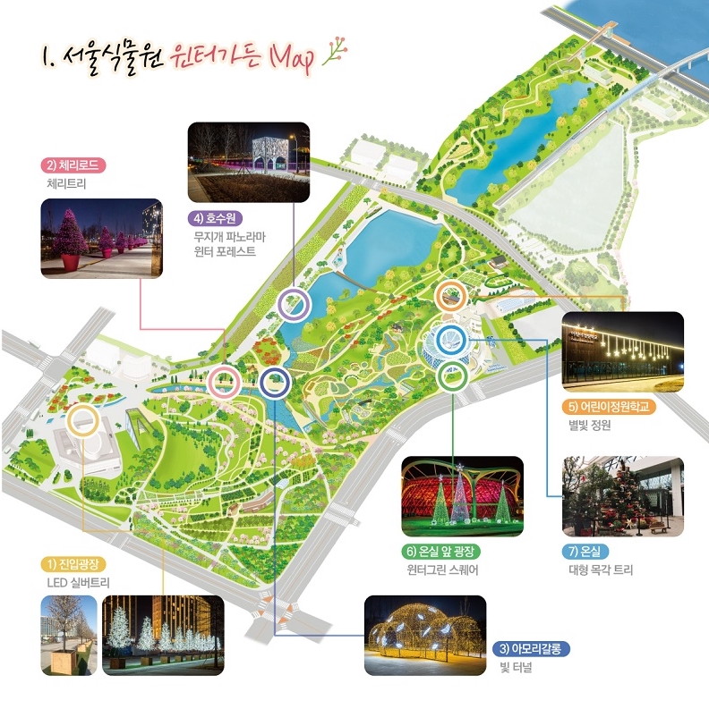 서울식물원 위치도. 독자에게 위치를 보다 싑게 이해하도록 '서울식물원 윈터가든(2018년 말~2019년 2월) 행사 안내도를 원용한다. 아래 쪽이 '열린숲'이고 중간 오른쪽은 '호수원', 왼쪽은 '주제원'이다. 위쪽 '습지원'은 한강과 접한다. 서울시
