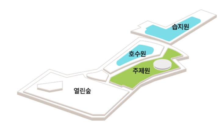 주제별로 나눠진 서울식물원. 열린숲, 호수원, 습지원, 주제원으로 나눠져 있다. 입구는 구역별로 여러 곳에 나 있다. 서울식물원