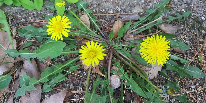 '열린숲' 길섶에 활짝 핀 민들레. 톱니바퀴와 같은 푸른 잎과 진노란 꽃이 대비된다. 식물원 길가에 아무렇게나 나 있지만 자세히 보니 꽃이 예뻤다.