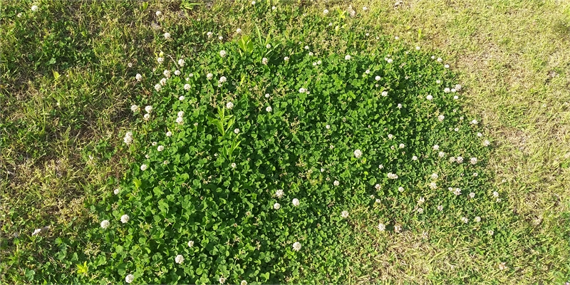 토끼풀로 불리는 클로버가 잔디밭에 군락을 이루며 자라고 있다. 어릴 때 시골에서 자란 분들에겐 팔찌 등을 만들며 놀던 추억의 풀이다.