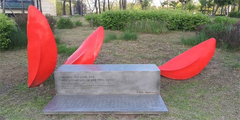 서울식물원 안내 입간판 옆에 위치한 빨간 조각 작품. 언뜻 보기엔 빨간 꽃잎을 형상화 한 작품으로 보였다.